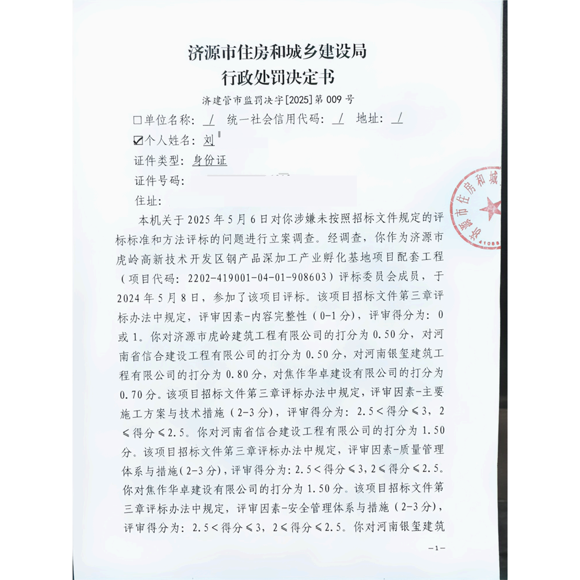 济源市住房和城乡建设局行政处罚决定书济建管市监罚决字(2025)第009号