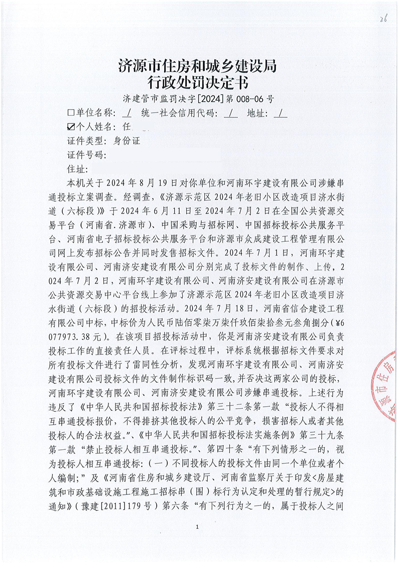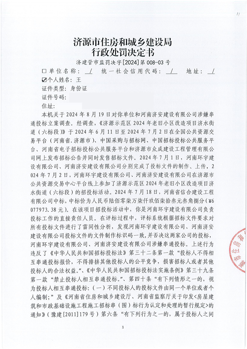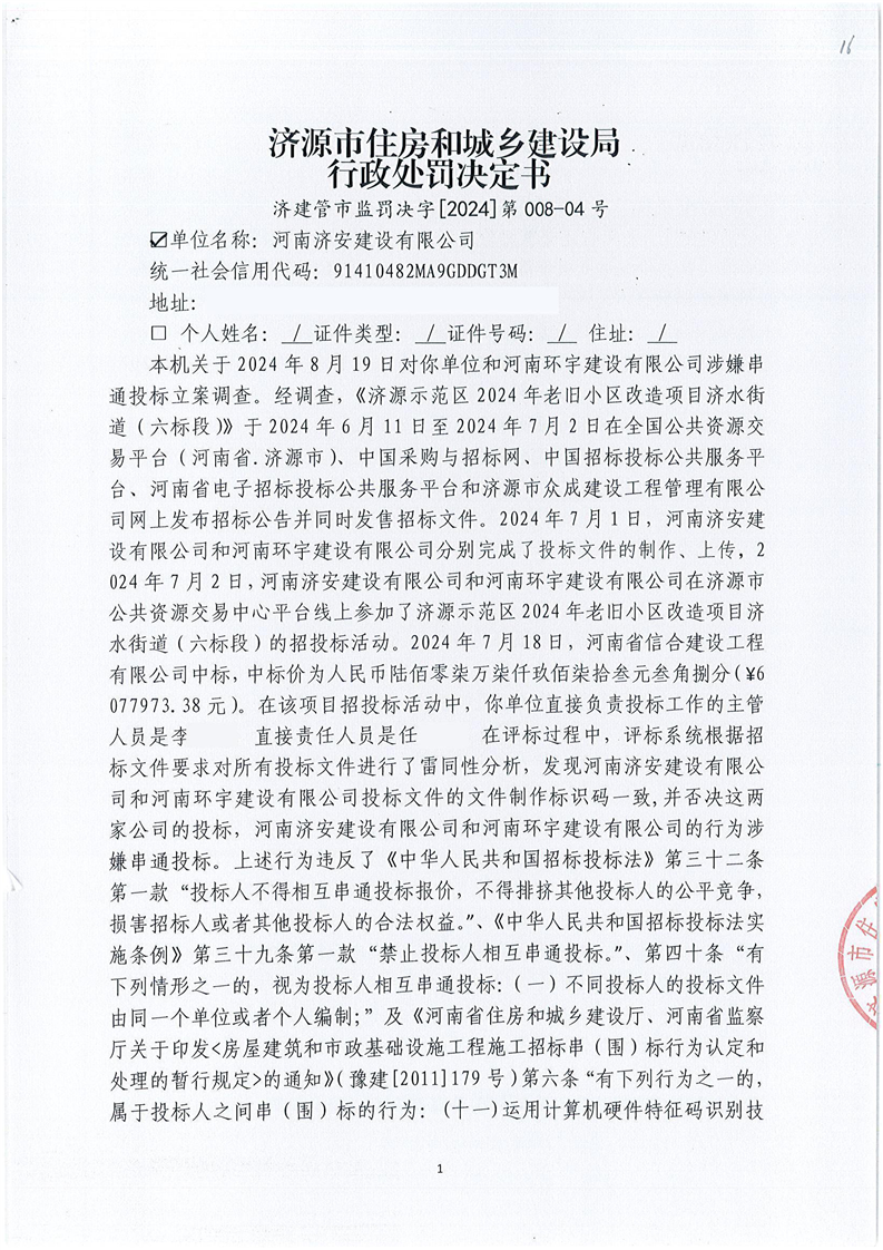济源市住房和城乡建设局行政处罚决定书济建管市监罚决字(2024)第008—01号