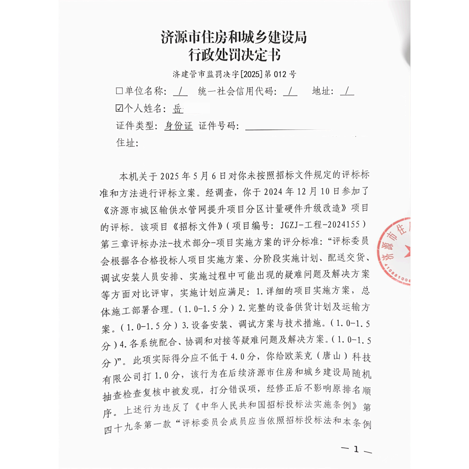 济源市住房和城乡建设局行政处罚决定书济建管市监罚决字(2025)第012号