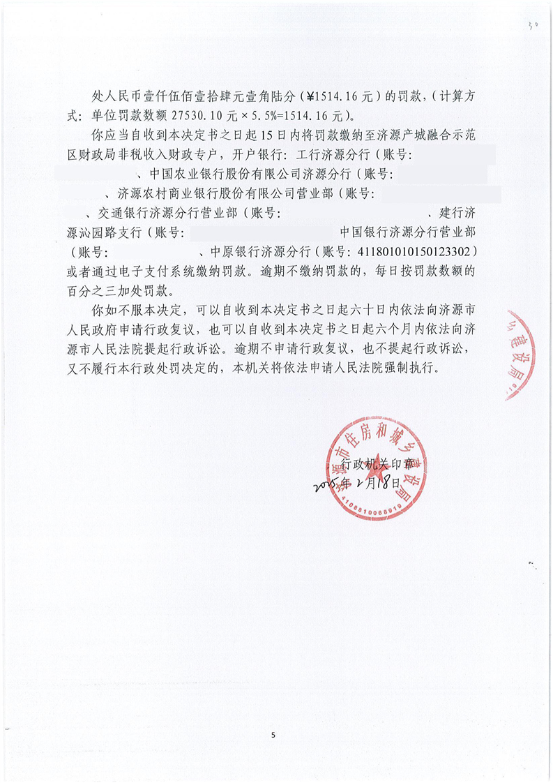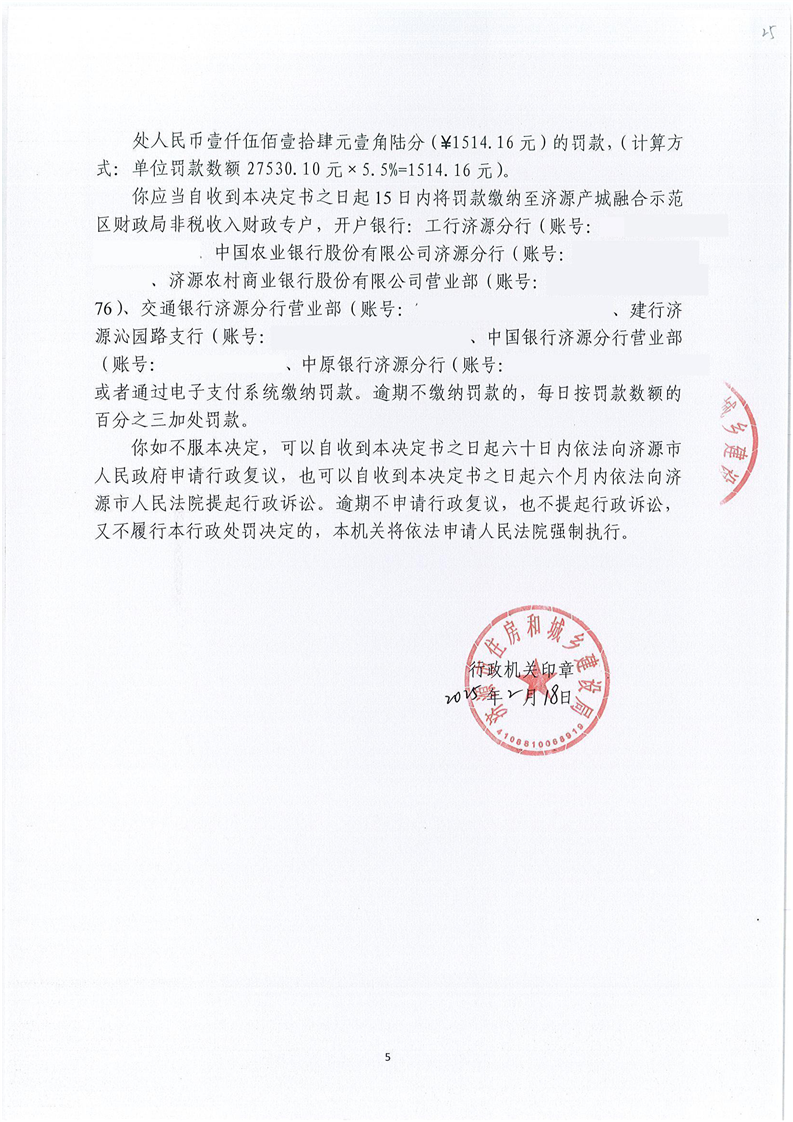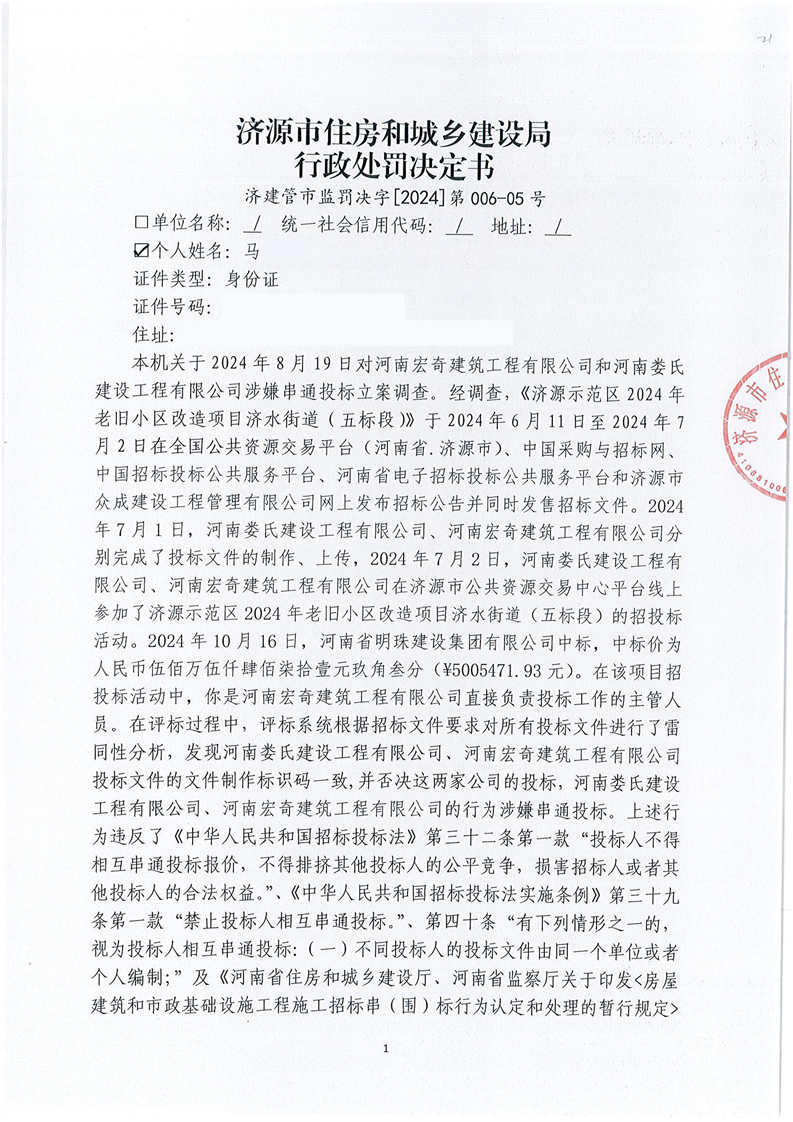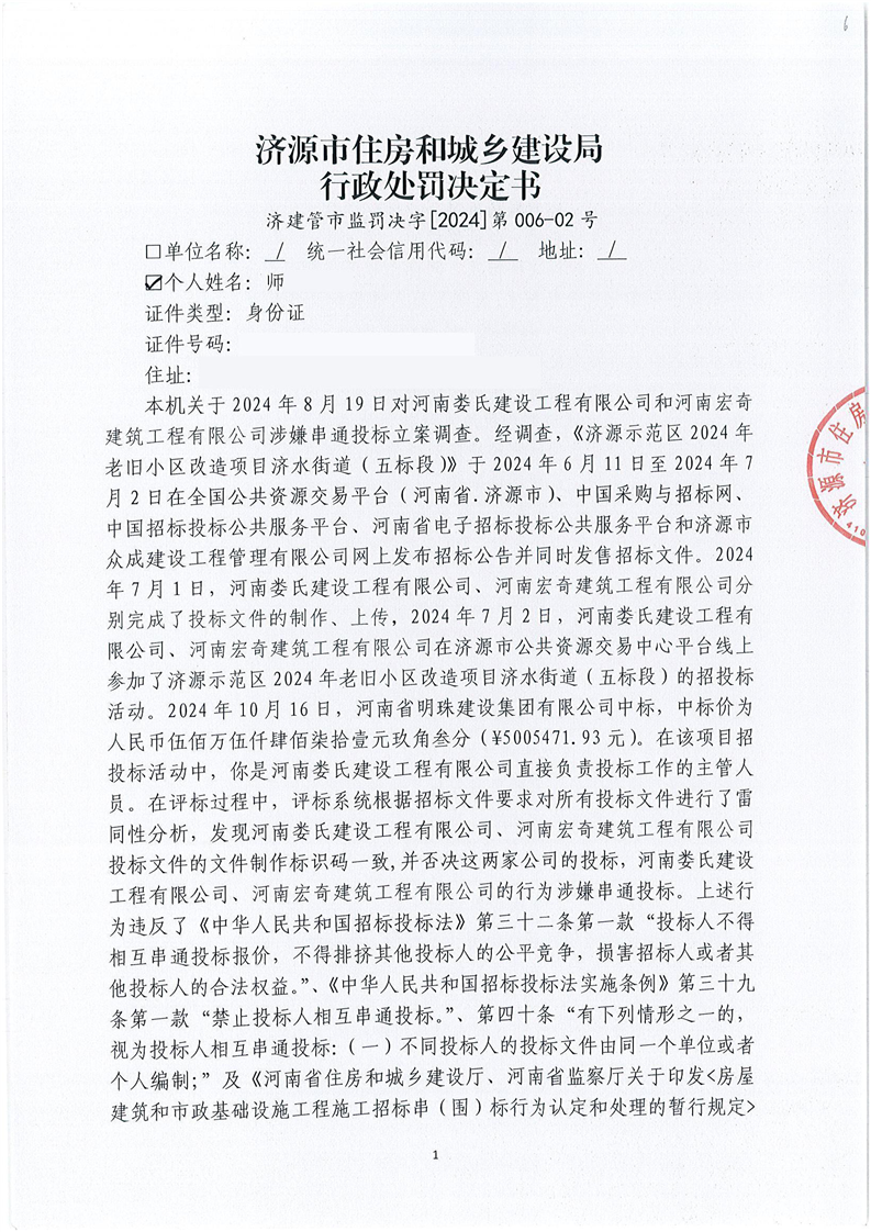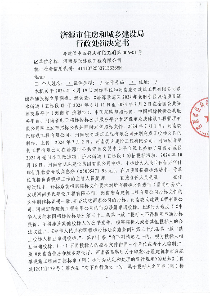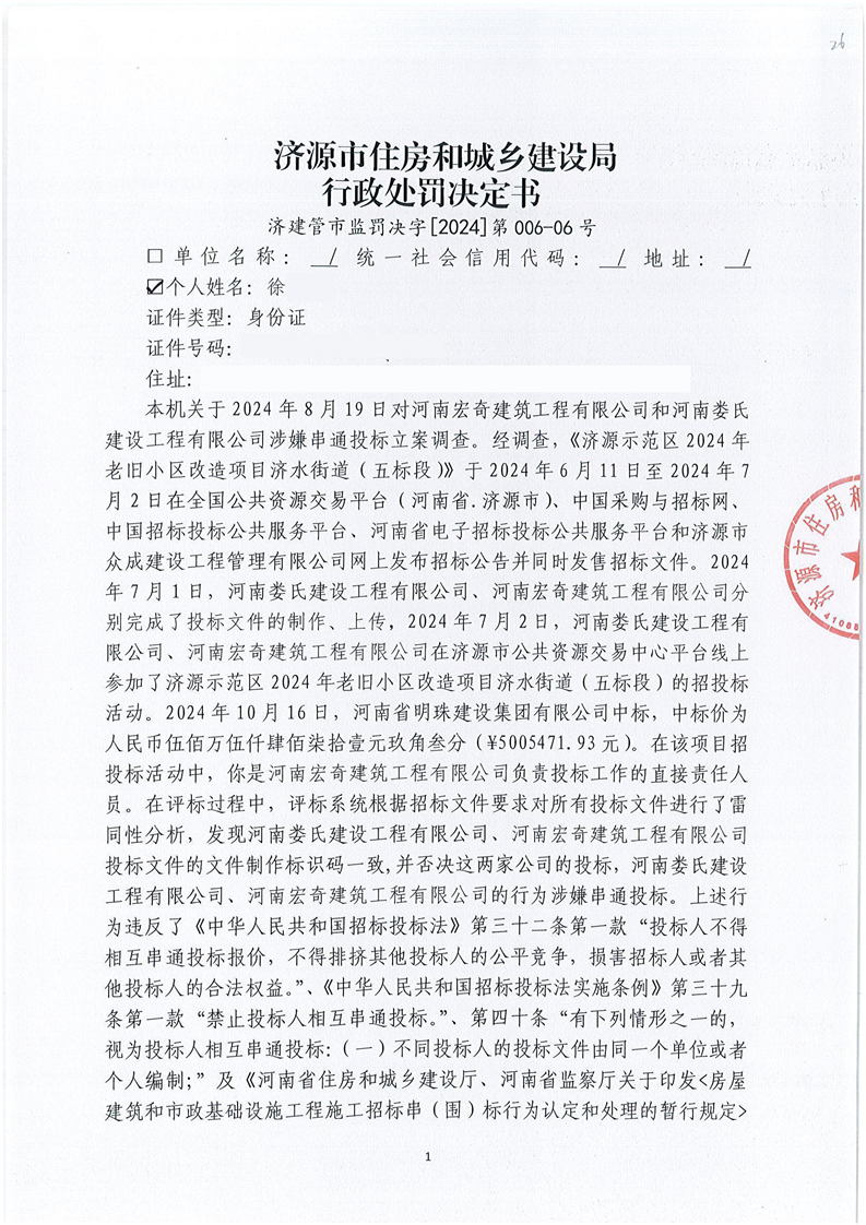 济源市住房和城乡建设局行政处罚决定书济建管市监罚决字(2024)第006—01号